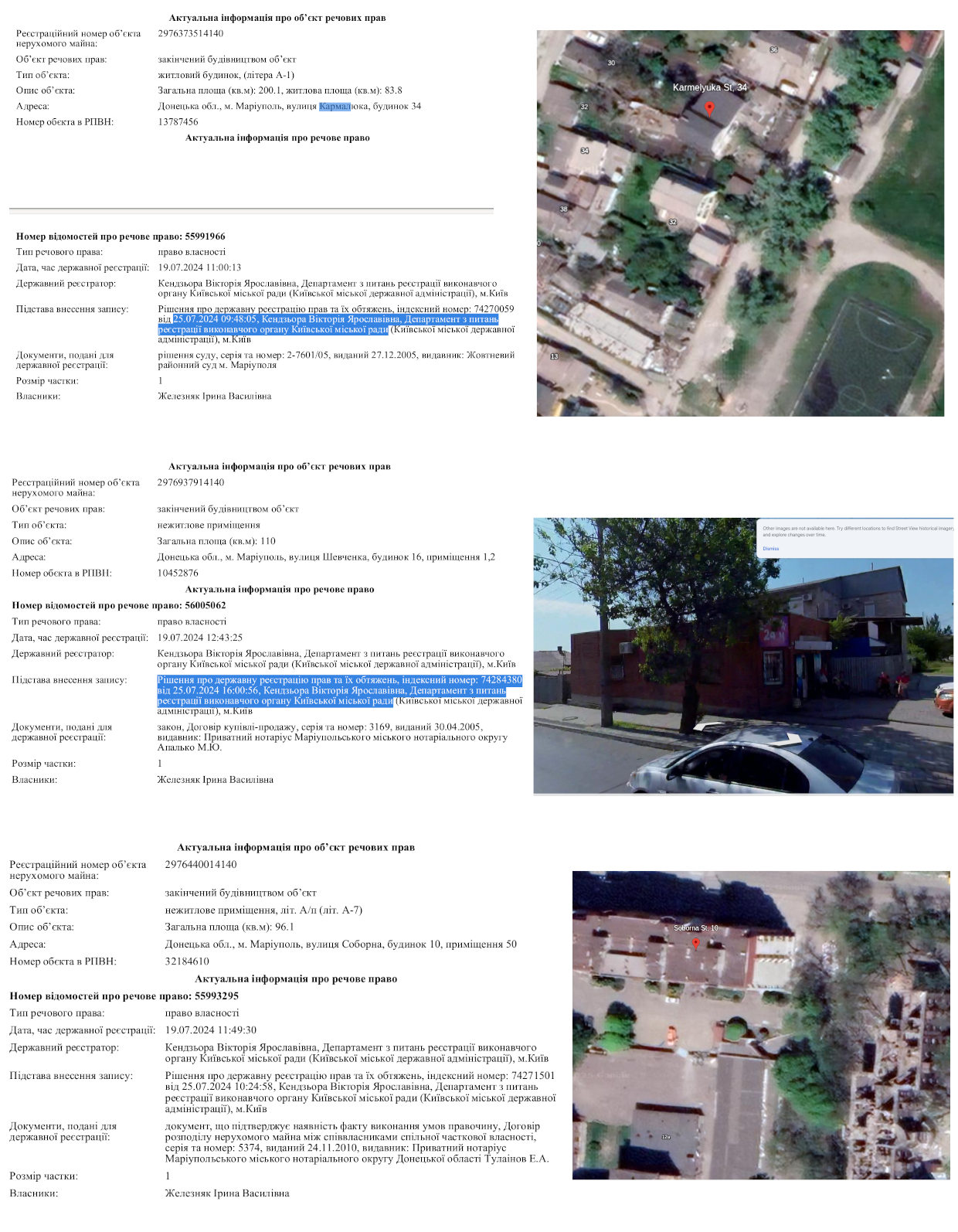 Повертаючись до майнового стану батьків Ярослава Железняка, з офісу яких по бульвару Шевченка в Донецьку розвивалась історія стосунків з обслугою «Уважаємого» (саме так у Донецьку прийнято називати Ріната Ахметова), зокрема з адвокатом Жигуліним, згадаємо про причетність останнього до законодавчих новел терористичного угруповання «ДНР» з питань реєстрації прав на нерухоме майно. За українським законодавством перереєстрація в Держреєстрі речових прав нерухомості громадян, яка була придбана до 2013 року (до запровадження держреєстру), є необов’язковою. Отже, на перший погляд дивним виглядають факти перереєстрації в 2024 році відповідної неушкодженою війною нерухомості у м. Маріуполі мати нардепа – Ірини Железняк: земельної ділянки та будинку 200 кв.м. на ній за адресою: вулиця Кармалюка, 34; земельної ділянки та магазина на ній за адресою: вулиця Шевченка, 16; офісу по вулиці Соборна, 10.