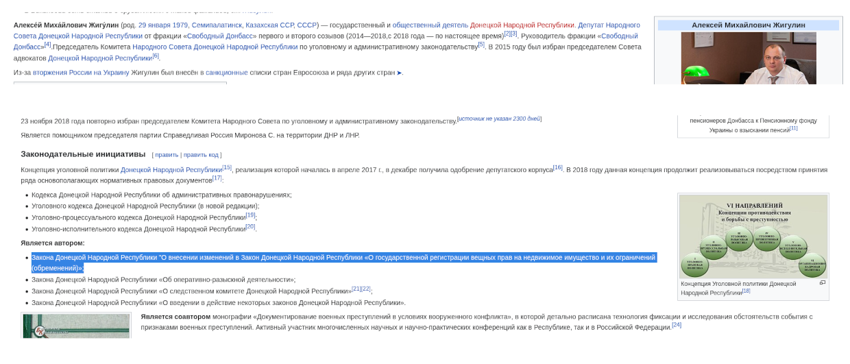 До речі, Жигулін є автором «Закона Донецкой Народной Республики «О внесении изменений в Закон Донецкой Народной Республики «О государственной регистрации вещных прав на недвижимое имущество и их ограничений (обременений)».