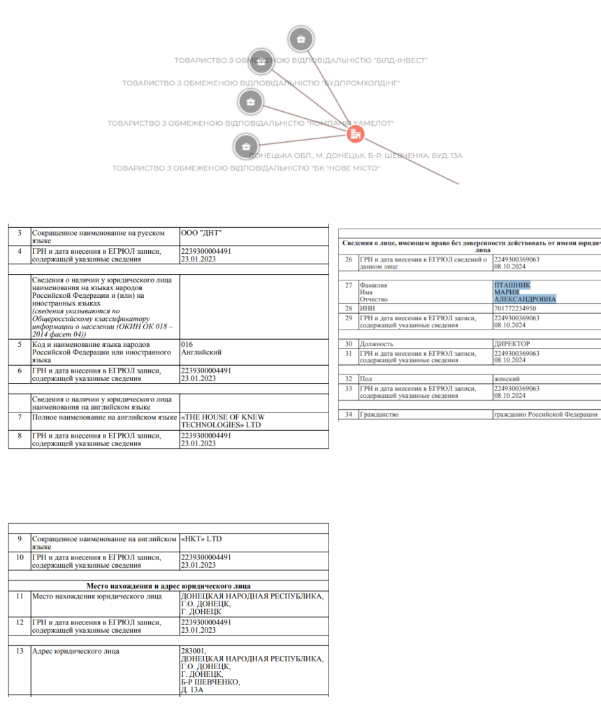 Однією з перереєстрованих компаній є «ООО ДНТ» на спрощеній системі оподаткування, яке надає послуги купівлі/продажу/оренди нерухомого майна, діяльність у сфері права. Директором «ООО ДНТ» є «Пташник Мария Александровна». Як було зазначено вище, у минулому скликанні Верховної Ради України Ярослав Железняк перебував на посаді помічника народного депутата Вікторії Пташник. Звичайно ми вважаємо простим збігом, що в одному фізичному або юридичному місці в Донецьку могли перетнутися одночасно шляхи родини Железняків, Віталія Жигуліна та Пташників, які в подальшому призвели до працевлаштування молодого студента Ярослава Железняка спочатку в російську компанію Kesarev Consulting, а згодом на посаду помічника нардепки Пташник.