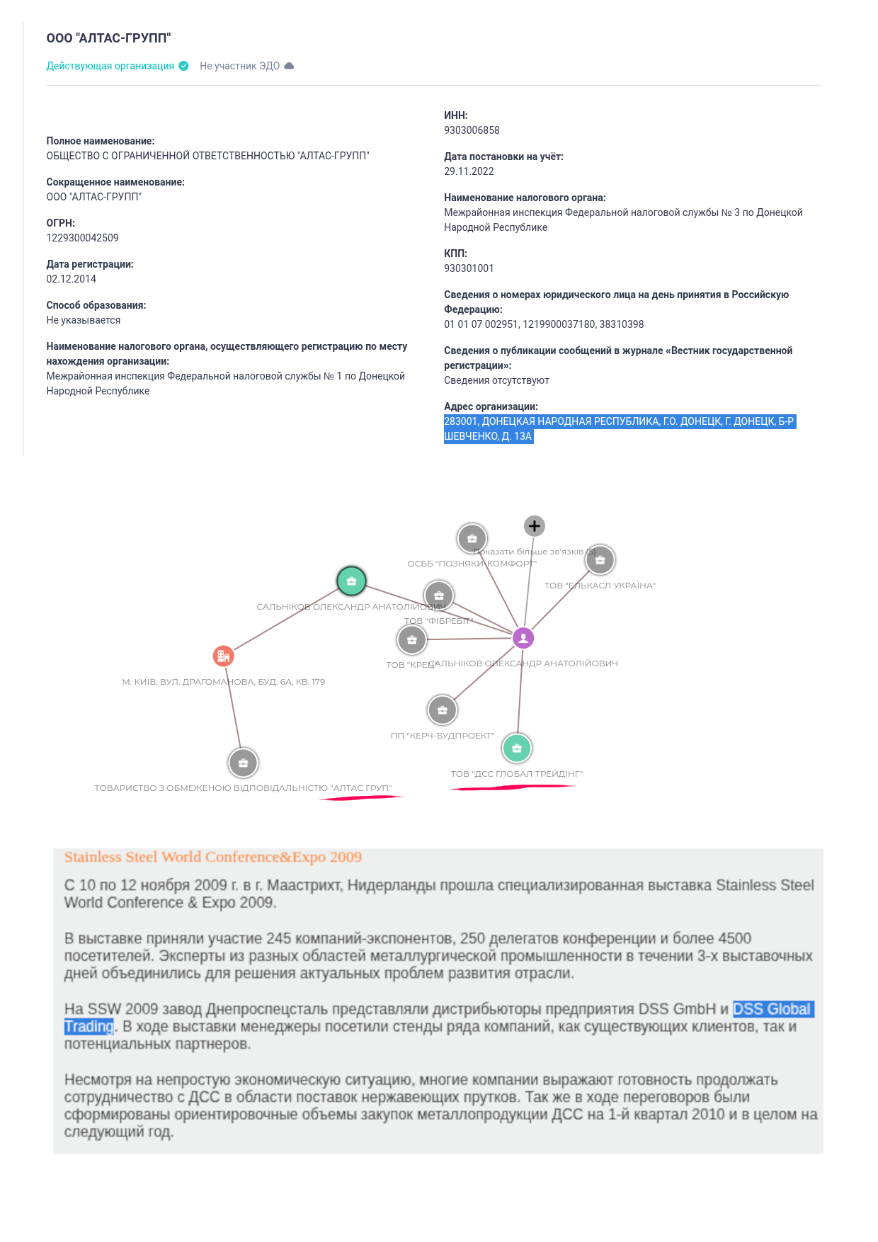 Ще однією з 4 юридичних оіб, зареєстрованих за адресою: м.Донецьк, бульвар Шевченка, 13-А, є така собі ТОВ «АЛТАС-ГРУПП» з досить незвичайною та унікальною назвою. В українському реєстрі знаходимо українську версію цієї компанії: ТОВ «АЛТАС ГРУП», якою володіє Сальнікова Тетяна Миколаївна, за адресою з якою в м. Києві мешкає її чоловік – «номінал» у більш цікавих ТОВках Сальніков Олександр Анатолійович.
