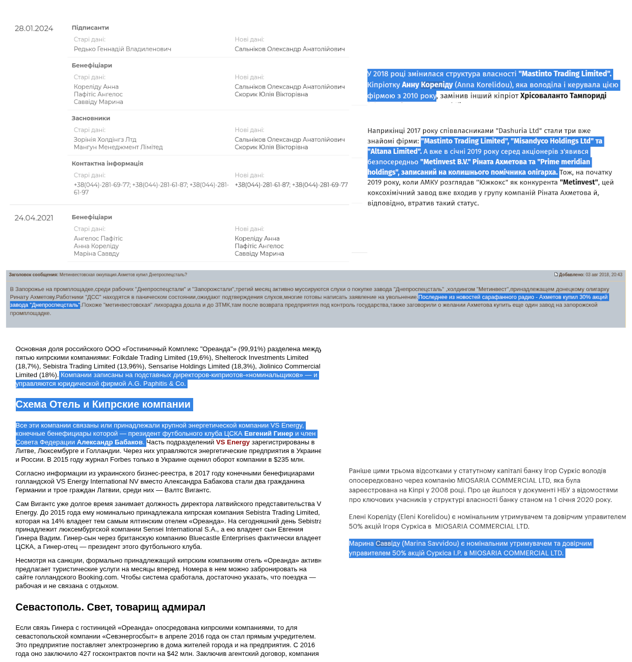 Ця інформація підтверджується й тим, що, за даними того ж реєстру, у період 2019-2024 років кінцевими бенефіціарами ТОВ «ДСС ГЛОБАЛ ТРЕЙДІНГ» були кіпрські фунти: Ахметова – Анна Кореліду, Суркіса – Марина Саввіду, Лужніковських – Ангелос Пафітіс. Таким чином, доходи з дистриб’юції товарів Дніпроспецсталі за кордон останні роки ділилися на трьох між Ахметовим, Суркісами та Лужніковськими. А з 2024 року зазначені інтересанти вирішили приховати своїх кіпрських фунтів за Сальніковим, дружина якого «володіє» київською ТОВкою, ДНРівський аналог якої зареєстрований за юридичною адресою керуючої компанії родини Железняків.
